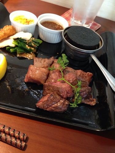 夜に一度だけ、行ったことがありましたが、今回はランチでお邪魔です。ステーキランチ1000円です。右上の石のような丸い器の上に、肉を乗せ、軽く焼きながら、ジャポネソースでいただきます。パンも2種、美味しかったです(≧∇≦)