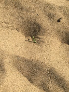 風に飛ばされて砂丘に着いたカマキリも、途方にくれていたわ。カマキリの足跡が可愛い。ツツツツ・・・・ってかんじ。こうして休み休み、歩き続けた。