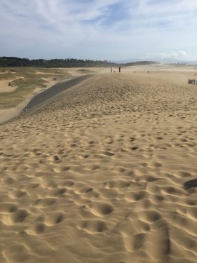 簡単にみえるのよ、ずっと砂地だし、すぐそこまで歩けば海が見える!日本海よ!くらいな勢いで歩き始める。だけど、歩いても歩いても海が見える場所へたどり着かない。風は横からびゅんびゅん吹くし、足が思うように前に進まず、カニのように横へ横へと(島根方面)流されそうになる。途中、もう引き返そうか・・・、大腿筋が痛い・・・と思った。