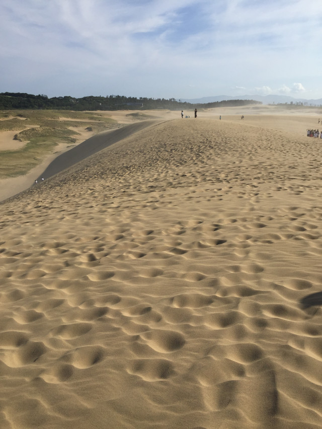 風紋も、夕方近くに行くと、人の足跡であまり綺麗じゃない。風で足跡が消える間もなく次の観光客が歩いて行くから。朝イチの砂丘が一番きれいらしい。